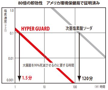図は次亜塩素酸ソーダを基準に殺菌力を比較しグラフ化したものです。HYPER GUARDは、カンジタ菌を殺菌するにあたり約230倍の殺菌力を示し、また大腸菌においては約80倍もの即効性を示しました。