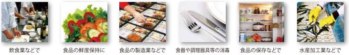 | ✕成分が残留し殺菌時に食材を傷め易くすすぎコスト、環境負荷が大。 | 〇有機物に触れると水にもどる特性があり、成分が残留しずらくデリケートな生鮮品でも食材を傷めない。 また、すすぎコストが大幅に軽減でき、浄化槽や排水に負荷が少なく環境に悪影響を及ぼす心配が無い。 |