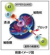 あらゆる細菌の撃退法の中で、生命が行っている撃退法ほど、安全かつ完壁なものはありません。細菌やウィルスが体内に侵入すると、免疫を担う好中球が酵素代謝を活発に行い、複雑な工程を経て、「HOC1」という物質を作ります。ところが、この物質は微弱であるにも関わらず、非常に分子が小さい為に如何に強靭なバリアで守られた細菌であっても、易々とバリアを貫通し、瞬時に細菌を死滅させることができます。このようなパラドックスともいえる巧妙な生命の殺菌のメカニズムを応用し、好中球万能かつ安全な「体内と同じ殺菌成分」の合成を行い、製品化したものがHYPERGUARDです。